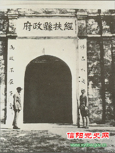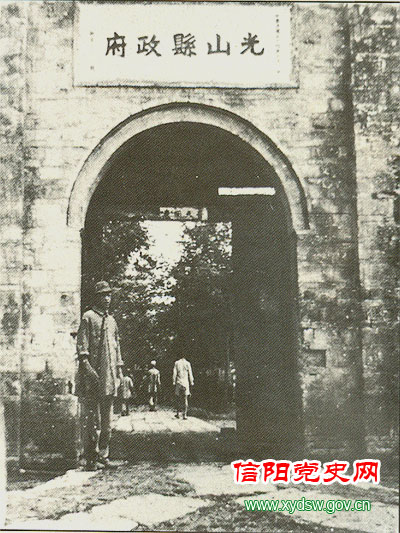 1949年1月前后,新县、商城、固始、光山、息县相继解放。这是解放光山后,解放军战士在城门前站岗