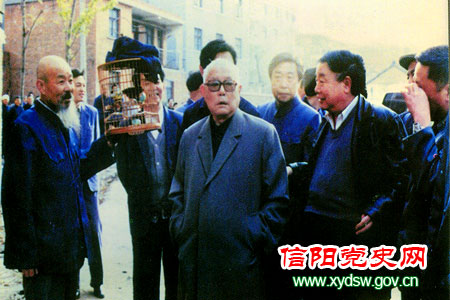 4月16日,李先念一行下榻信阳浉河宾馆。翌日早晨,晨雾刚刚散去,信阳市街区景色格外清新迷人,小鸟啁啾地叫着。在工作人员的陪同下,李先念信步向河公园走去。此时,一位遛鸟的退休老工人提着鸟笼走来,李先念便走过去与老工人亲切地交谈起来,关心地询问这位老工人的生活情况。当他得知老工人老有所养、老有所乐时,脸上露出欣慰的笑容。