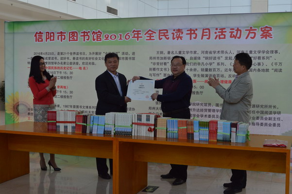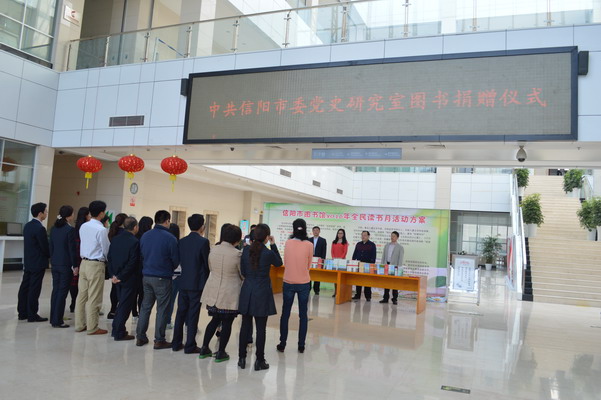 为迎接第21个世界读书日,根据《中共信阳市委党史研究室创建国家文明城市实施方案》,中共信阳市委党史研究室决定开展向信阳市图书馆捐赠“红色书籍”活动。4月21日,中共信阳市委党史研究室图书捐赠仪式在市图书馆一楼举行。仪式上,市委党史研究室主任蒋文俊、副处级纪检员焦予玲带领全室党员干部向市图书馆捐赠了《红色览胜——信阳革命遗址》(上下册)、《信阳改革开放实录》、《红廉大别山》等十余种图书共137册。这些图书汇聚了近年来信阳市委党史研究室和有关专家学者在大别山红色文化、中共信阳党史和信阳改革开放的历史进程等方面的重要研究成果。市文广新局副局长梁光旭、市图书馆馆长崔亚军接受捐赠并向捐赠者表示衷心感谢。按照市图书馆安排,我室捐赠的“红色书籍”均陈列在市图书馆三楼“地方文献”书架,以供读者随时查阅。
