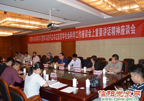 2016年5月26日,信阳市社科界举行学习贯彻习近平总书记在哲学社会科学工作座谈会上重要讲话精神座谈会。市社科联调研员刘向阳主持座谈会,市社科联秘书长黄国治传达了全省宣传文化系统学习贯彻习近平总书记在哲学社会科学工作座谈会上重要讲话精神专题会议提纲。来自市委党校、信阳职业技术学院、信阳师院、市法学会、信阳农林学院、市实验高中、市育才中学、信阳日报社、市国税局、淮滨县文联等相关负责同志作了交流发言。