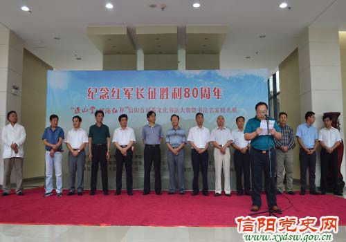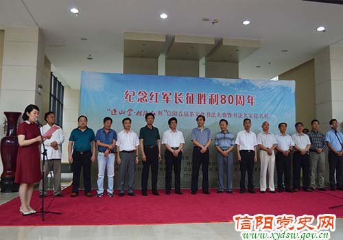 8月26日,由中共信阳市委党史研究室、信阳市书法家协会、信阳博物馆联合主办的“纪念红军长征胜利80周年‘正山堂•信阳红杯’信阳首届茶文化书法大赛暨书法名家作品提名展”在信阳市博物馆开幕。中共信阳市委副书记刘国栋,信阳市人民政府副市长谢天学,信阳市人大原主任宋效忠,信阳市政协副主席曹茂明,信阳职业技术学院党委书记李第民、院长余运德,信阳市委党校原校长王开科等领导出席开幕式。信阳市文联主席殷丽主持开幕式,信阳市委党史研究室主任蒋文俊、正山堂信阳红旗舰店代表和福建正山堂茶业有限公司代表分别致开幕词,信阳市人民政府副市长谢天学作重要讲话,市委副书记刘国栋宣布展览正式开幕。