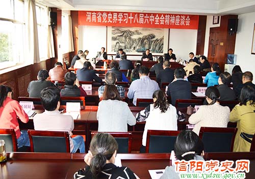 11月10日,为深入学习宣传党的十八届六中全会精神,省委党史研究室、省中共党史学会、省中共党史人物研究会联合在郑州召开了河南省党史界学习十八届六中全会精神座谈会。来自省委党校、河南大学、解放军信息工程大学、焦裕禄干部学院、大别山干部学院、省团校及党史部门的专家学者50余人出席座谈会。省委党史研究室主任韩斌在座谈会上作主题发言。省委党史研究室副主任路海江、贺明洲出席会议。会议由路海江主持。
