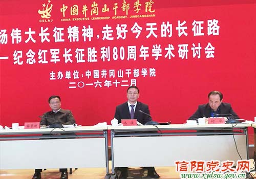 为深入贯彻学习习近平总书记在纪念红军长征胜利80周年大会上的讲话精神,进一步弘扬红军长征的光荣传统和伟大的长征精神,中国井冈山干部学院于2016年12月16日至18日召开了“弘扬伟大长征精神,走好今天的长征路——纪念红军长征胜利80周年”学术研讨会,参会人员约70人,其中特邀嘉宾和专家代表30余人。中共信阳市委党史研究室副主任祝辉应邀参加了研讨会。