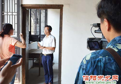 在新县刘邓大军司令部旧址听信阳市委党史研究室主任蒋文俊讲述“刘邓大军千里跃进大别山的历史作用”情景