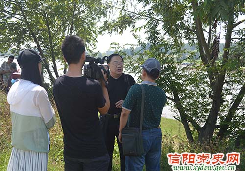 在刘邓大军渡淮处听信阳市委党史研究室主任蒋文俊讲述“将军试水”的故事情景